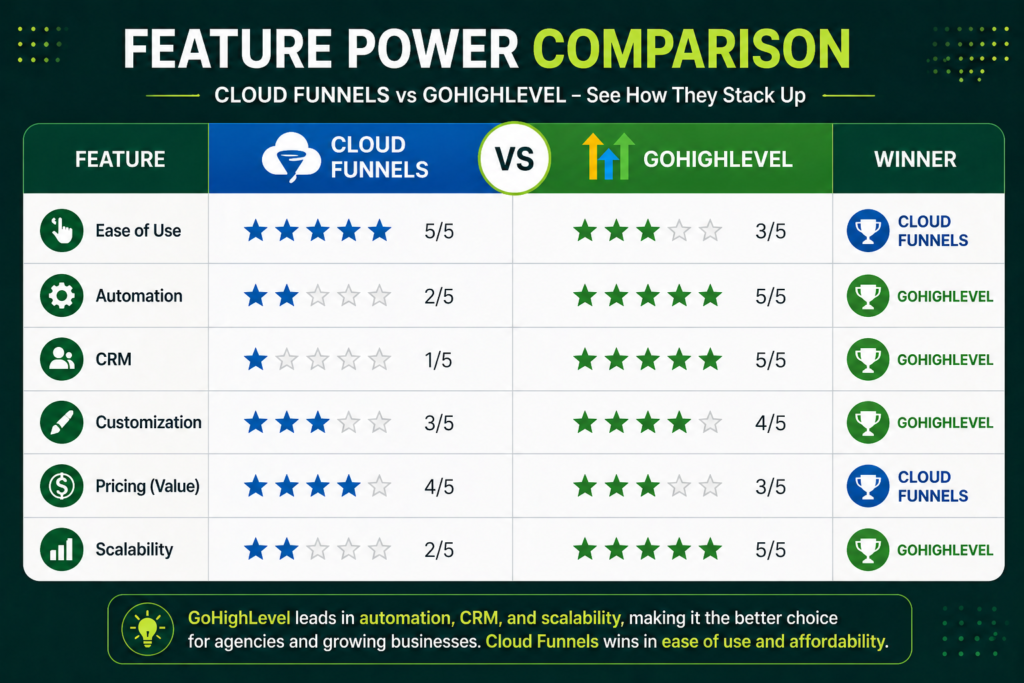GoHighLevel wins. Better automation and follow-up systems mean more leads get contacted, nurtured, and converted. With Cloud Funnels, leads that do not convert right away are often lost.